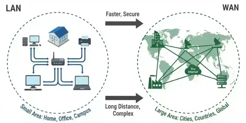 A LAN connects devices within a small area, such as a home or office. A WAN links multiple LANs across cities, countries, or even the world.