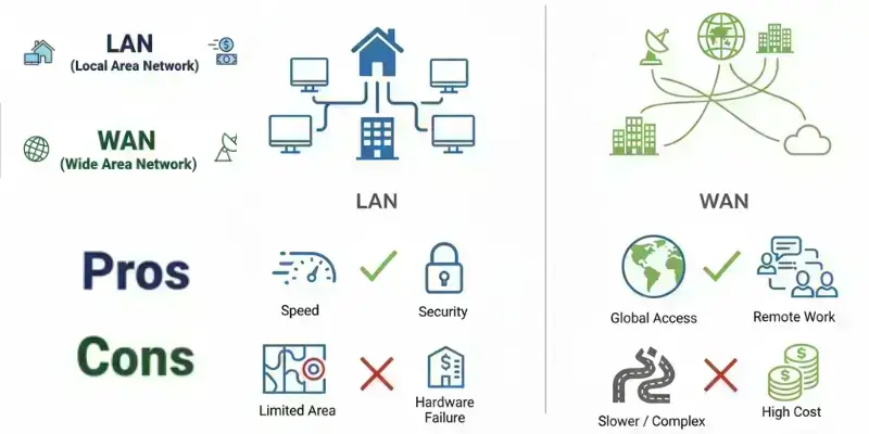 Consider your primary needs. If speed and simplicity are important, LANs are a practical choice. To connect many people or locations, a WAN is preferable. Select the network type that matches your requirements for effective results.